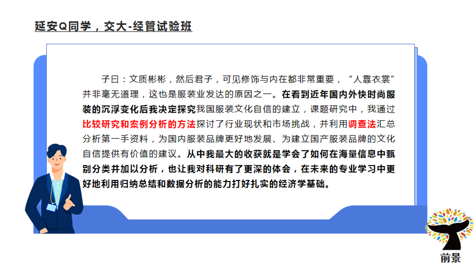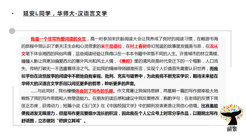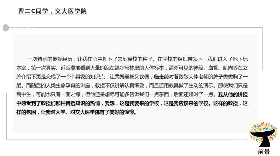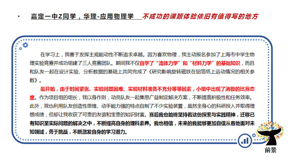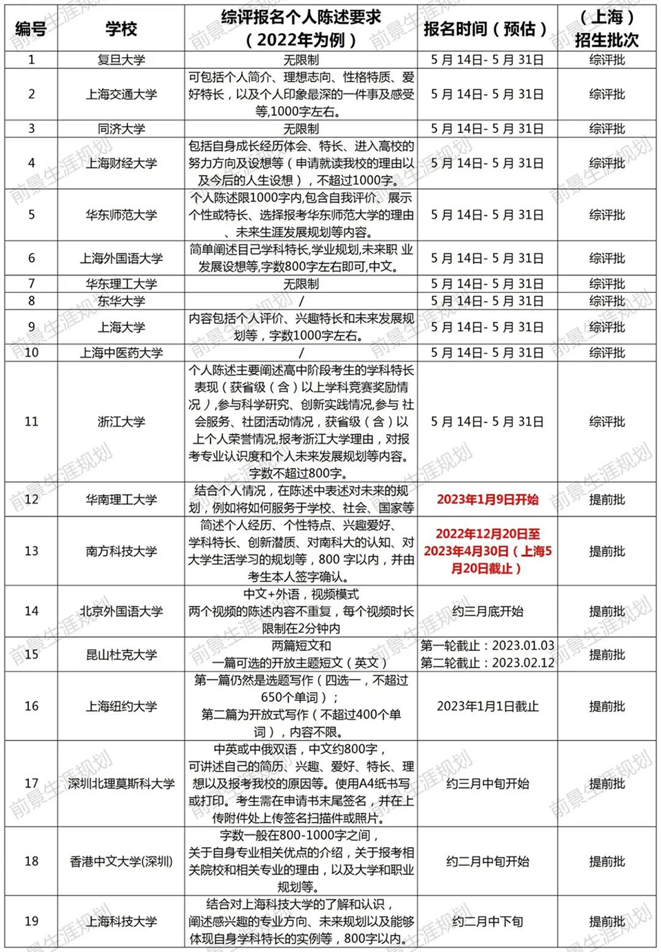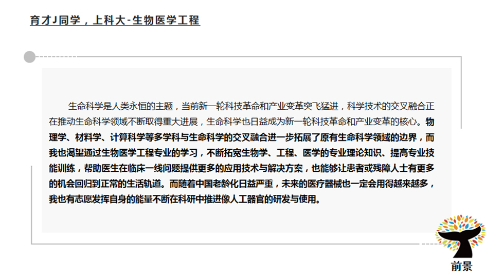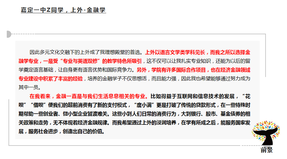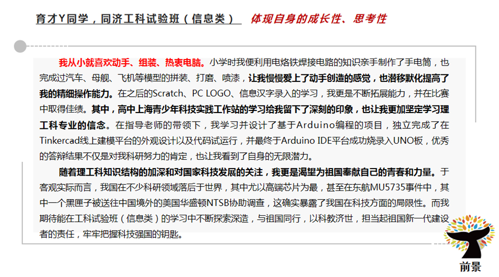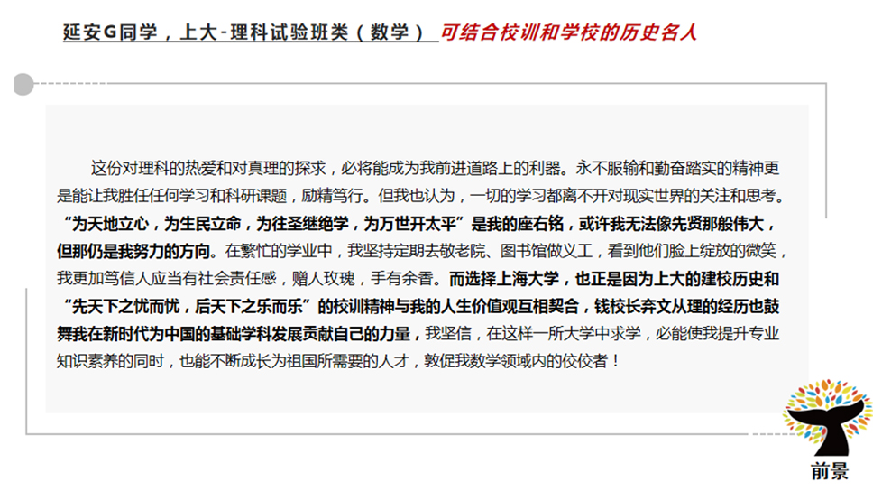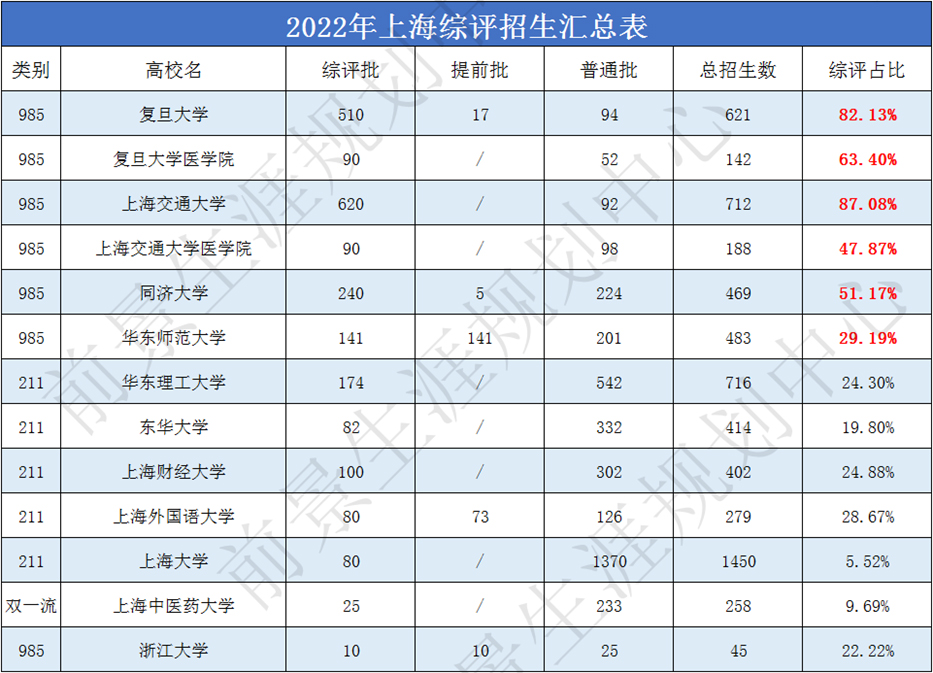 综评批就是综合评价招生。考生是可以参与高考综评的报名,但是想要填报综评批次的高考志愿,高考成绩必须要达到特殊类型招生控制分数线(2021、2022年特殊类型招生控制分数线都为503分)。随后,各高校会在高考出分后公布各自入围分数线并安排入围考生进行校测,按照综合成绩(高考成绩85%+校测成绩15%),从高到低进行录取直至到达当年的招生计划数。 目前,上海综评招生的院校共11所。分别是复旦大学、上海交通大学、同济大学、华东师范大学、上海外国语大学、上海财经大学、华东理工大学、东华大学、上海大学、上海中医药大学和浙江大学(10所上海院校+1所浙江大学)。 2022年,上海秋考考生总人数为44839人。根据数据分析,22届高三学子2.92%的高考生通过综评批进入复旦大学与交通大学(包括医学院)。此处必须注意,复交综评占比都在80%-90%,因此,对于目标在复交的同学综评就是不可错过的最佳入学路径!4.95%的高考生通过综评进入上海本地985、211院校。 ![]() 1、综评填志愿可以填几个学校? 综评批次考生最多可以填报4个院校专业组志愿,每个院校专业组内最多可以填报4个专业志愿。 2、如果填报的志愿分数都到了,面试都要去吗? 一名学生只有1次面试机会。 3、综评是什么志愿顺序? 综评实行“平行志愿”招生,按照“分数优先,遵循志愿,一轮投档”的原则。因此,考生在填报志愿时,应该把想去的专业填在前面。综评批次的面试入围规则是按照招生计划数的1:1.5,存在33.3%的面试淘汰率,若入围后未被录取,不影响后续批次的录取。 4、550-570分可以报名哪几个学校? 2022年入围线570以下的院校有东华、上财、上外、上大和上中医。但是,报名的时候建议可以按照自己专业的意向度可以加入更高分段的院校,以防超水平发挥因未填报而无法去面试而深感惋惜。 5、综评的具体流程是什么? 以2021年综评日程为参考,2023年综评具体时间按公示为主。 5月中下旬:网上报名、提交个人陈述 6月3日前:公布初审结果 6月7-9日:高考 6月23日:公布高考成绩 6月26-27日:综评志愿填报 7月2-4日:综评校测面试 7月7日:综评录取结果查询 6、综评批会有该学校的所有专业吗? 复旦、交大、同济、华师大、上财几乎所有专业都在综评批次招生,复旦、交大两校个别专业仅在综评招生;其余高校的综评招生专业多为其热门专业,具体专业和招生计划请参考当年的招生简章。 7、入选“英才计划”对综评可以加分吗? “英才计划”对于高考没有任何加分。但是“英才计划”对于考生的学科特长、学术眼界有着极大地提升。并且,入选“英才计划”的学生会进入大学英才库,会让高校对你有着更多地了解。 8、综评面试需要注意什么? 一、面试前: 1)综评材料的充分准备,但是必须保证申报材料的真实性。包括:个人陈述、高中时期获取奖项、社会实践活动等。 2)清晰解读自己所填报的专业、学院与高校,找到自身与高校的契合度,以及一系列面试技巧的练习(其中包括时政热点的看法、课题研究、实践活动等)。 3)了解各院校面试形式。(1对1面试代表院校:复旦;1对多面试代表院校:交大、同济、华理、东华、华师大、上外、上大;多对多面试代表院校:上财、浙大、上中医)。 二、面试时: 1)着装建议干净、整洁、合身。不建议选择校服参加面试。 2)保持镇定,自信回答。为了考察考生的心理素质和应变能力,提问问题肯定是天马行空的,切记出现结巴、面红耳赤等一系列小动作。 3)参加前景综评面试班,通过前景在综合素质的锻炼,帮助同学在综评面试中脱颖而出! 9、综评时候考官审阅的自我介绍和个人陈述写作包括哪些要素? 个人陈述是综评最重要的材料,用词断句都要仔细斟酌,落笔不可轻慢。 ![]() ![]() 个人陈述的写作误区 常见误区: 1、罗列或详写高中的学习成绩。 2、罗列或详写各项比赛、竞赛及奖项。 3、罗列或详写各项社会实践及其他活动经历。 前景建议: 1、选择能够体现自身成长性、思考性、独特性的事例。 2、写作重点是体现自己的所思所想,所感所悟。 写作素材如何取舍?(附样例) 1、学术潜力 展示你的勤思爱问、探索求真的精神。学会埋点,但不要捏造、过分夸大自己的经历。 ![]() ![]() 2、兴趣爱好和社会实践 和专业的关联,由兴趣或实践引发对专业的好奇。体现你的软实力是与专业匹配的。 ![]() ![]() 3、高校价值观认同 你了解你想要报考的高校吗?考大学是为了将来找份好工作、赚更多的钱,还是追逐自己的梦想,成为更优秀的自己? ![]() ![]() 4、对专业的理解与规划 以小见大,从身边事去谈对专业的理解,这样更符合学生的视角。 ![]() ![]() ![]() |